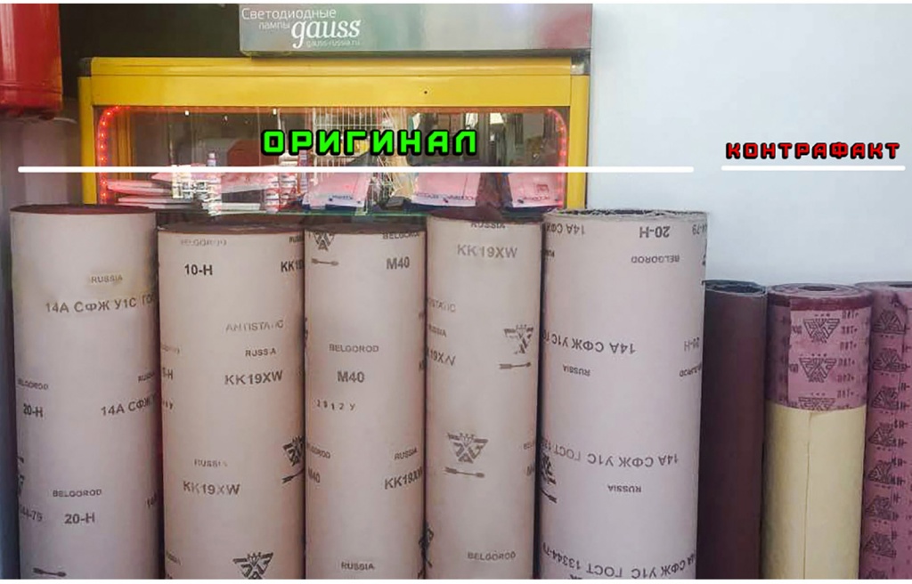Обычно контрафактная продукция продается совместно с оригинальной и по цене ниже за погонный метр (площадь погонного метра шлифовальной шкурки контрафакта меньше оригинала), что дополнительно вводит потребителей в заблуждение. 2) Цвет шлифовальной шкурки. Контрафактная продукция выпускается на основе темнее оригинала.